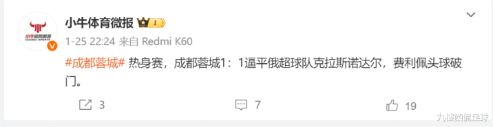 据悉,在这场热身赛中,两边打的有来有回,强度颠倒大,最终凭借费利佩的头球,成王人蓉城战平了敌手。